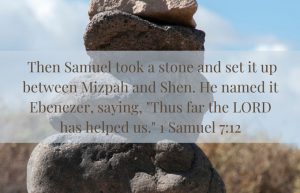 “Kemudian Samuel mengambil sebuah batu dan mendirikannya antara Mizpa dan Yesana; ia menamainya Eben-Haezer, katanya: Sampai di sini TUHAN menolong kita.”